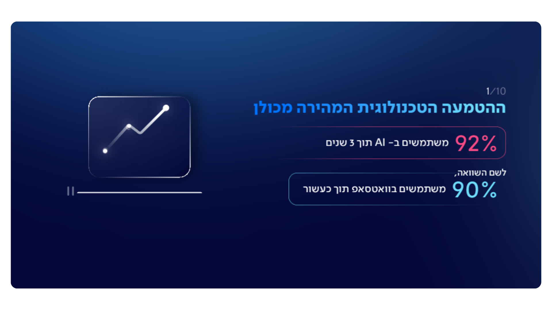 לשם השוואה, לוואטסאפ נדרשו כ-10 שנים כדי להגיע לכ-90% אימוץ, וקניות אונליין רשמו אימוץ של 90% רק לאחר כ-20 שנים. השימוש ב-AI נעשה ברמה יומיומית והוא מתרחש יותר בנייד מאשר במחשב. נוסף לכך, הישראלי הממוצע מרחיב את סל הכלים בו הוא משתמש: מ-1.8 כלים ב-2024 ל-2.7 כלים ב-2025.