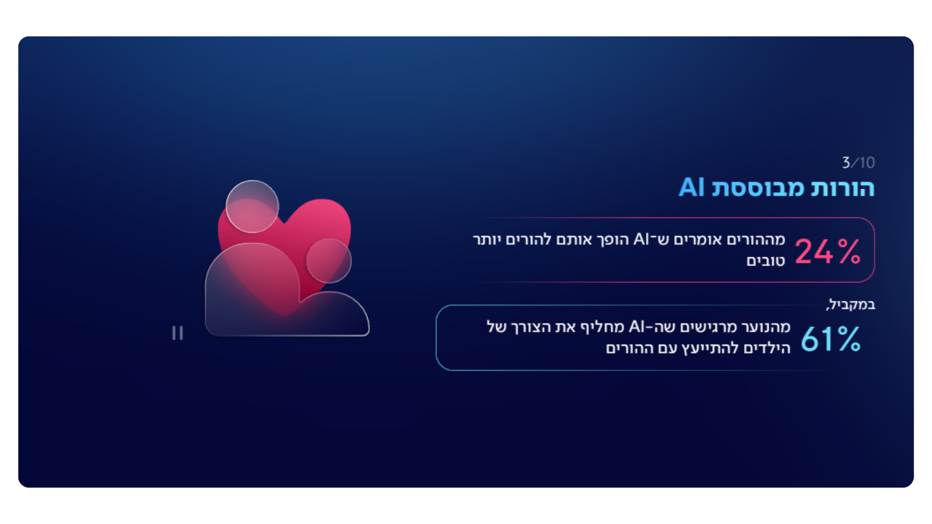 במרחב ההורות נרשמת כניסה עמוקה של ה-AI כשכבת סיוע יומיומית: למעלה משליש מההורים (35%) מתייעצים איתו בענייני חינוך הילדים, 45% משתמשים בו ליצירת רעיונות לפעילויות משפחתיות משותפות, ואף כרבע (24%) מדווחים שה-AI הופך אותם להורים טובים יותר. לצד התועלות, מתגלה גם מחיר 61% מהנוער אומרים שה-AI מחליף אצל הילדים את הצורך להתייעץ עם ההורים, נתון שמחדד את האיזון העדין בין העצמה דיגיטלית לבין שחיקה אפשרית בקשר ובאוטונומיה ההורית.