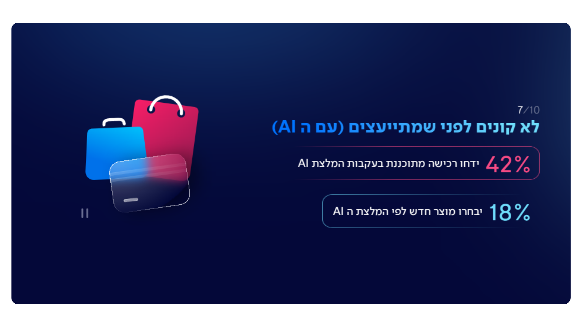 ה-AI נכנס עמוק לעגלת הקניות של הצרכן הישראלי, כאשר 64% נעזרים בו לקניות, 42% ידחו רכישה מתוכננת בעקבות המלצתו, ו-18% יבחרו מוצר חדש שהמליץ להם. במקביל הדרך “מהחיפוש לרכישה" משנה צורה- 35% מתחילים את חיפוש המוצרים קודם כל ב-AI, ו-58% טוענים שישקלו להשתמש בסוכן קנייה מקצה לקצה שימצא את המוצר, יאתר את הדיל ויבצע את ההזמנה עד סופה. עם זאת, ל-50% מהישראלים יש בעיה לשתף פרטי תשלום עם ה-AI, מחשש כאמור שהמידע ידלוף או יעשה בו שימוש לרעה.