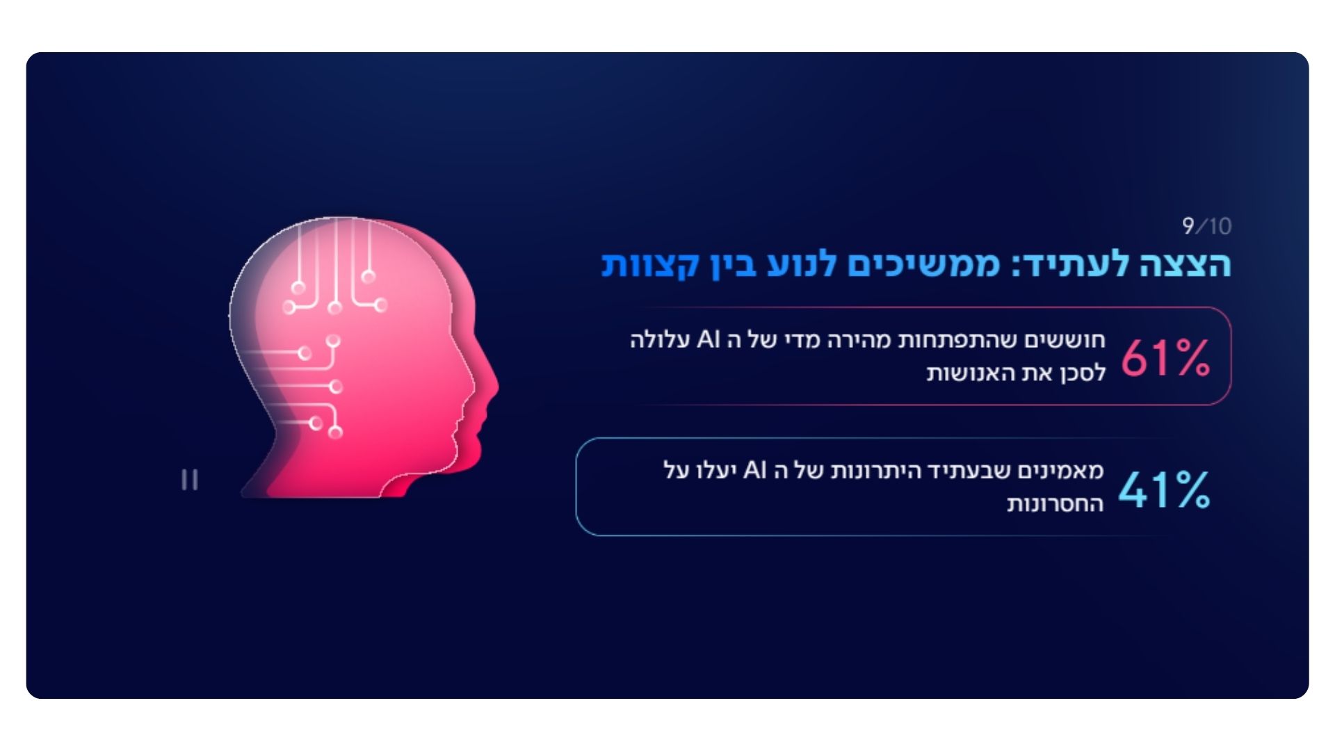 בהמשך לכך, כאשר בוחנים את תחומי העיסוק השונים מתברר כי רמות החשש אינן אחידות: בענף הבנקאות והפיננסים 43% מהעובדים חוששים כי תפקידם ישתנה באופן מהותי או יהפוך למיותר בעקבות כניסת ה-AI; בתחום שירות הלקוחות שיעור החוששים עומד על 36%, בהייטק 26%, בהוראה וחינוך 16%, ובתחום המכירות 14%. נתונים אלו ממחישים כיצד הטכנולוגיה נתפסת כגורם מטלטל בזירות שונות, אך גם מחדדים את הפער בין תחושת האיום לבין התקווה שה AI יוכל לשמש כלי משמעותי בהכוונת הקריירה ובבניית עתיד תעסוקתי חדש.