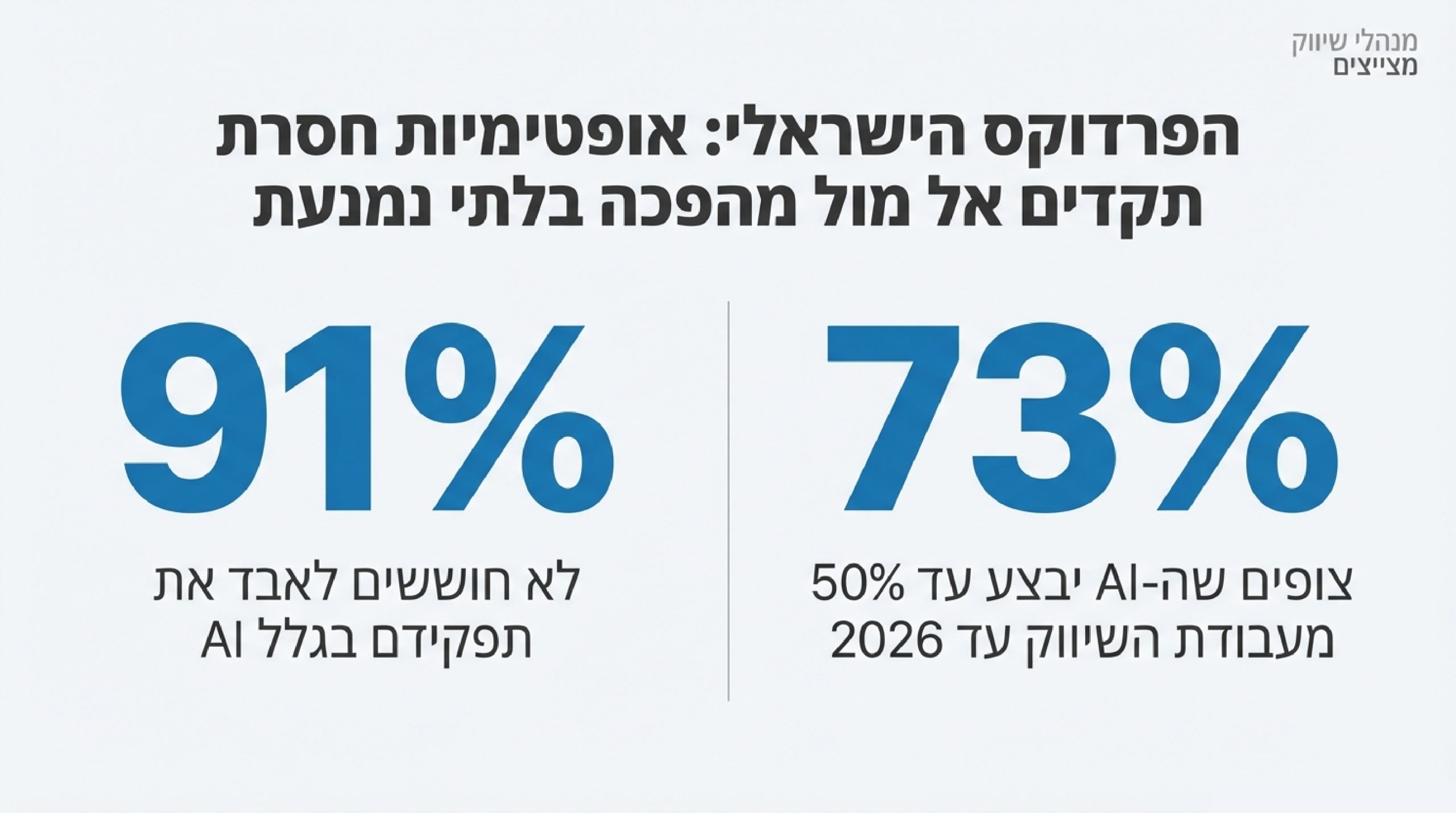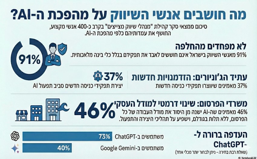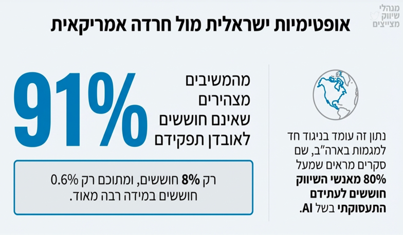 91% מאנשי השיווק הישראלים מצהירים שאינם חוששים לאובדן תפקידם בגלל כלי בינה מלאכותית – נתון דומה לסקר שנה שעברה. רק 8% חוששים, ומתוכם רק 0.6% חוששים במידה רבה מאוד.