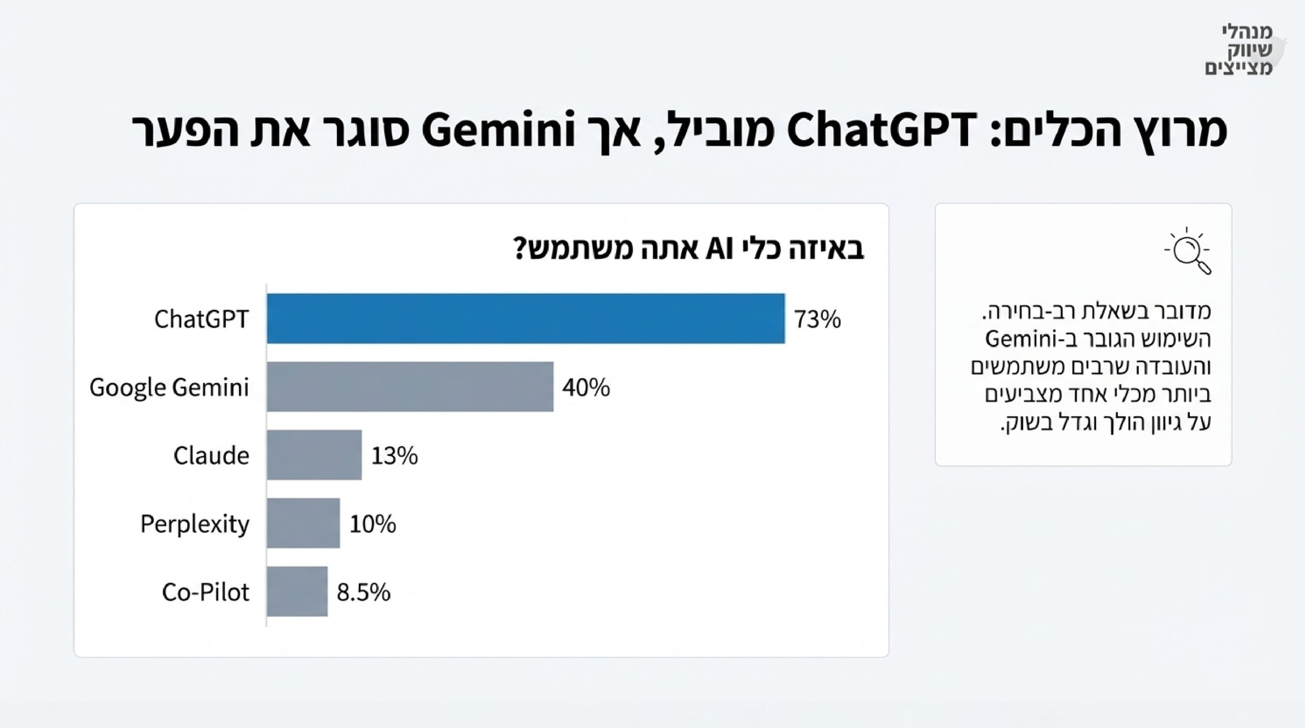 מדובר בשאלת רב-בחירה, ולכן רבים משתמשים ביותר מכלי אחד. ChatGPT מוביל בבירור, אך Gemini מצביע על גיוון הולך וגדל.