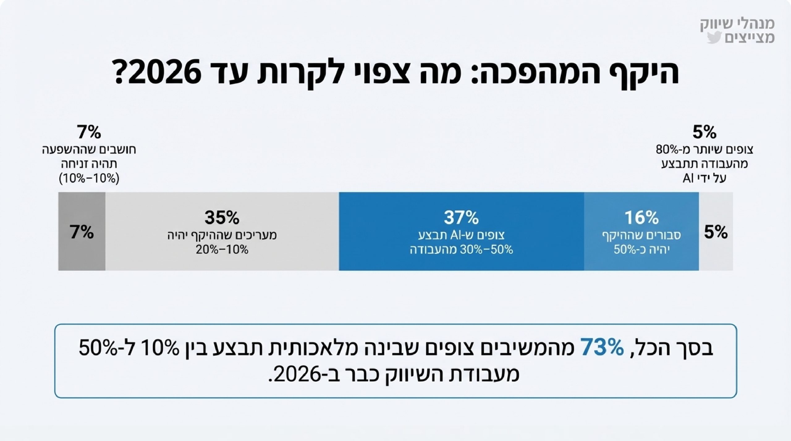 בסך הכול, 73% מהמשיבים צופים שבינה מלאכותית תבצע בין 10% ל-50% מעבודת השיווק כבר ב-2026.