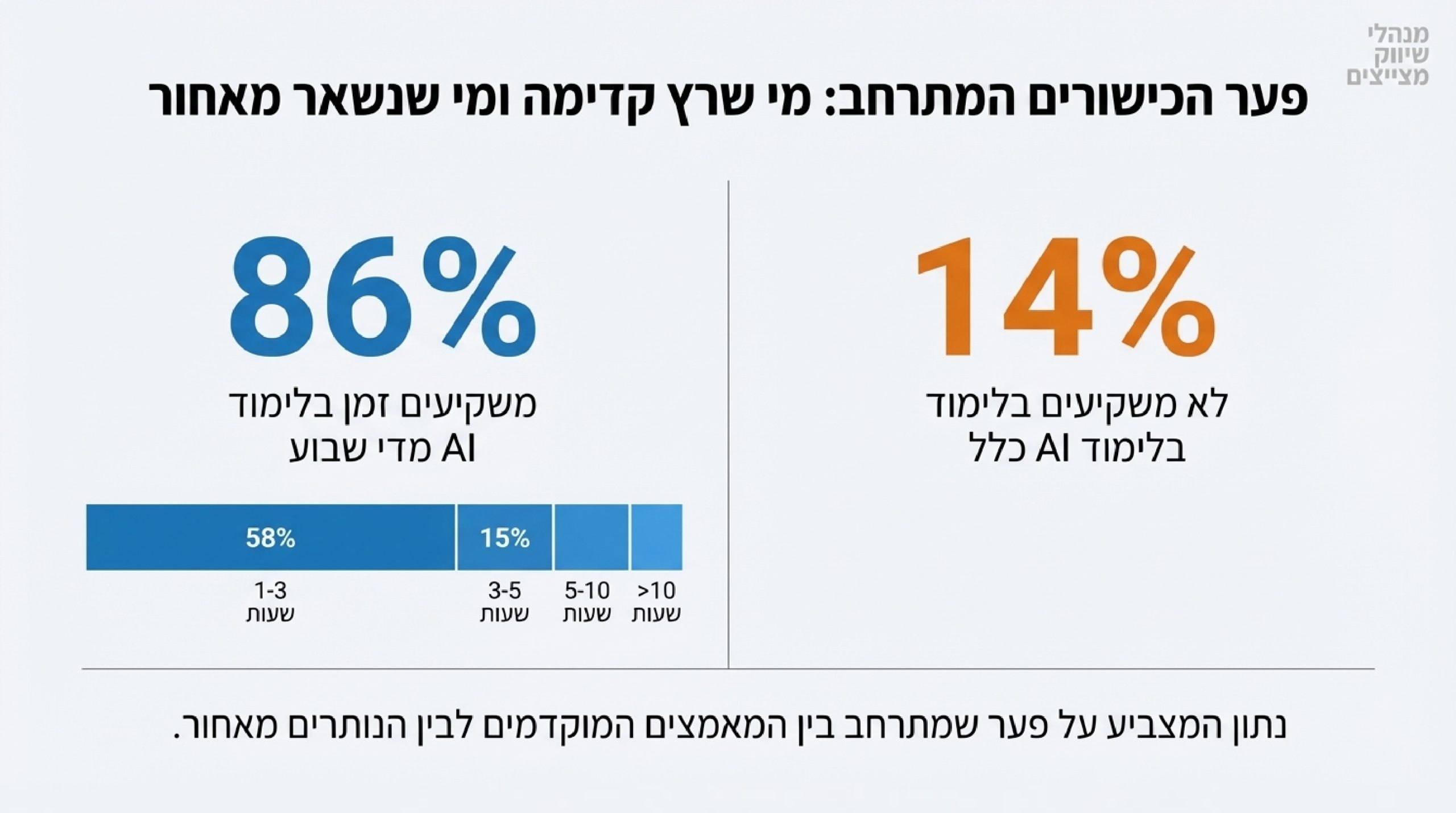 • 58% משקיעים 1–3 שעות שבועיות בלימוד AI