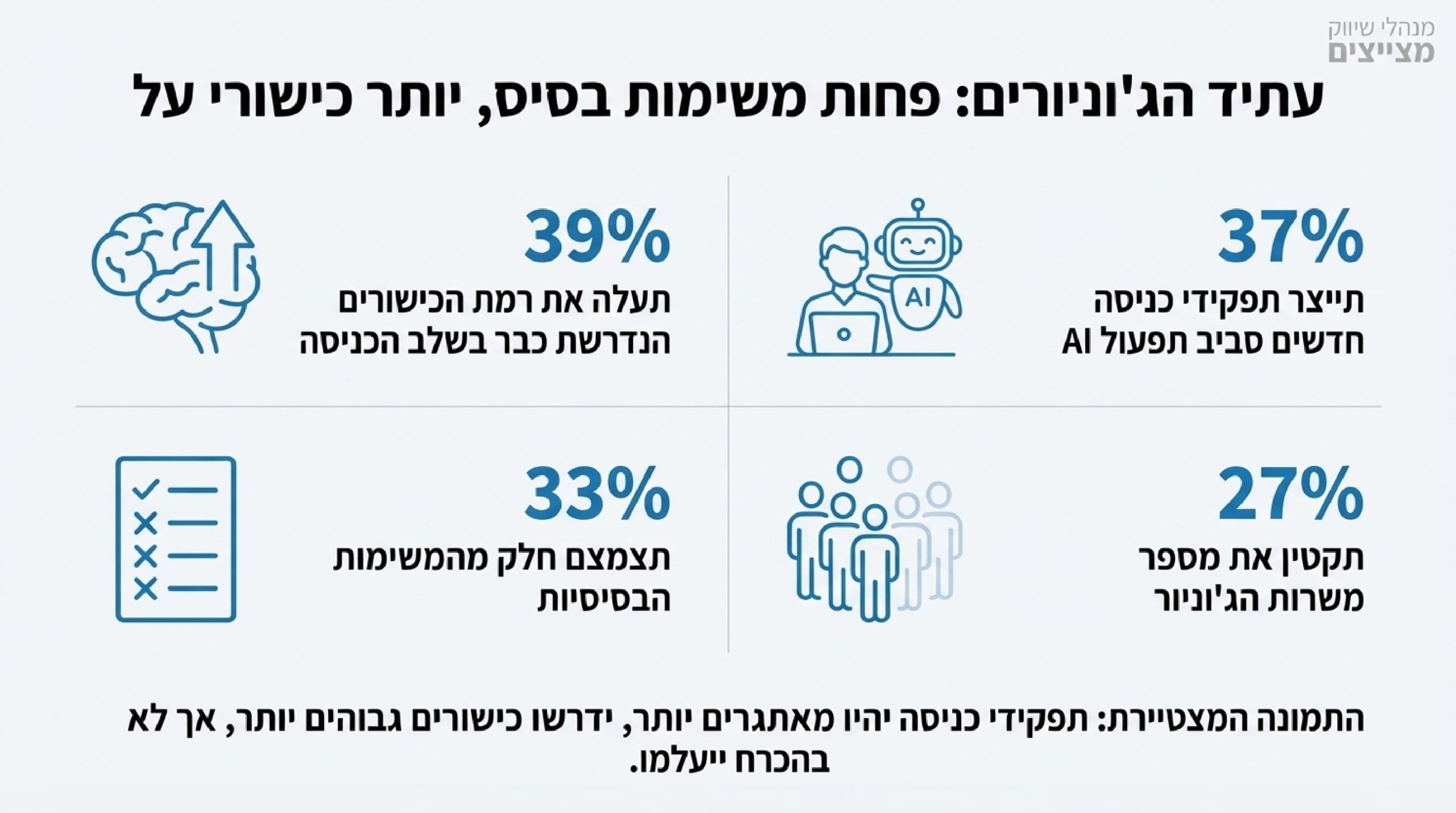 התמונה המצטיירת: תפקידי כניסה יהיו מאתגרים יותר וידרשו כישורים גבוהים יותר מהיום, אך לא בהכרח ייעלמו. במקביל ייווצרו תפקידים חדשים סביב ניהול ותפעול כלי AI.
