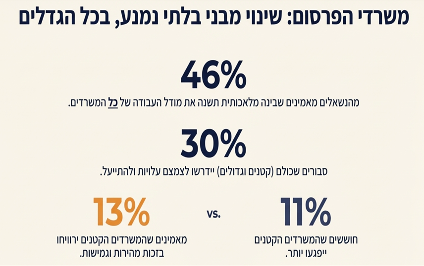 התמונה: שינוי מבני צפוי בכל המשרדים, עם דגש על יעילות תפעולית ולא בהכרח על גודל המשרד.