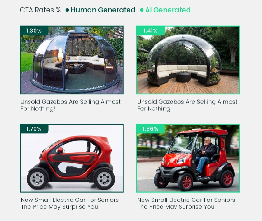 • מודעות GenAI מתפקדות טוב באותה מידה כמו מודעות שנוצרו בידי אדם: מודעות שנוצרו על ידי AI הראו רמת ביצועים המשתווה לזו של מודעות שנוצרו ביד אנושית. הנתונים הגולמיים הראו שמודעות AI רשמו שיעור הקלקה (CTR) ממוצע גבוה מעט יותר (0.76%) לעומת מודעות אנושיות (0.65%), אם כי בבחינה תחת בקרות סטטיסטיות מחמירות, הביצועים היו דומים.